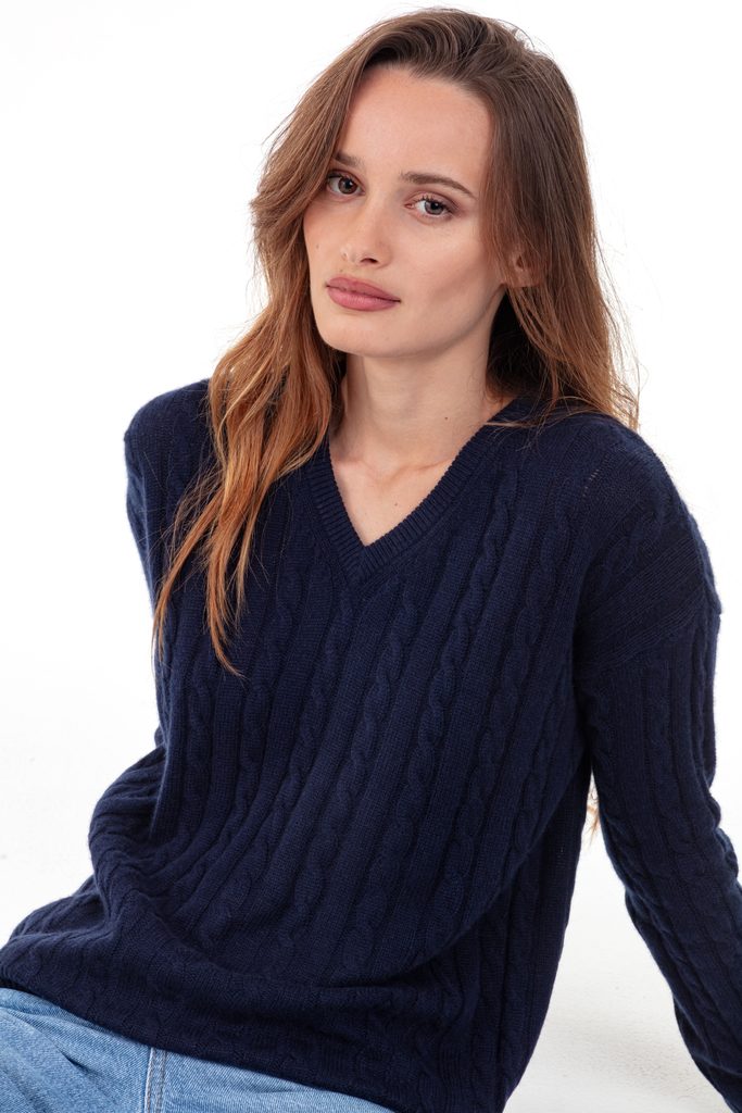 Elegant and timeless, the PYLA women’s jumper enchants with its cable knit and refined style. Crafted in 100% 4-ply cashmere, it offers a perfect balance of warmth and comfort. Its wide straight cut and V-neck make it a feminine, versatile piece.